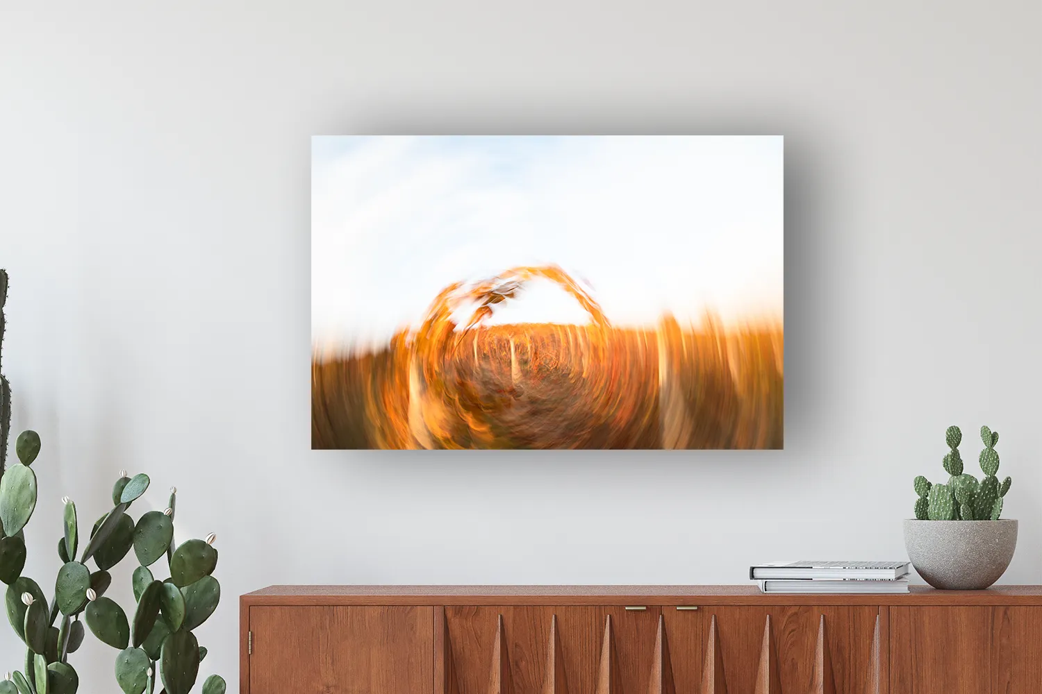 Der weite Lichtbogen führt den Blick mühelos und öffnet die Komposition. Du erlebst eine helle, klare Weitung im Raum, die sich wie ein inneres Aufatmen anfühlt. Die warmen Herbstfarben schaffen Geborgenheit und atmosphärische Tiefe. Du fühlst Ruhe, Wärme und eine sanfte Präsenz, die den Raum auflädt, ohne ihn zu überfordern. Die Auflösung der Form lässt Dich nicht Objekte wahrnehmen, sondern Stimmung und Licht. Du erlebst einen Moment, der Dich in ein ruhigeres, tieferes Sehen führt und Dich an Deine eigene Wahrnehmung erinnert.