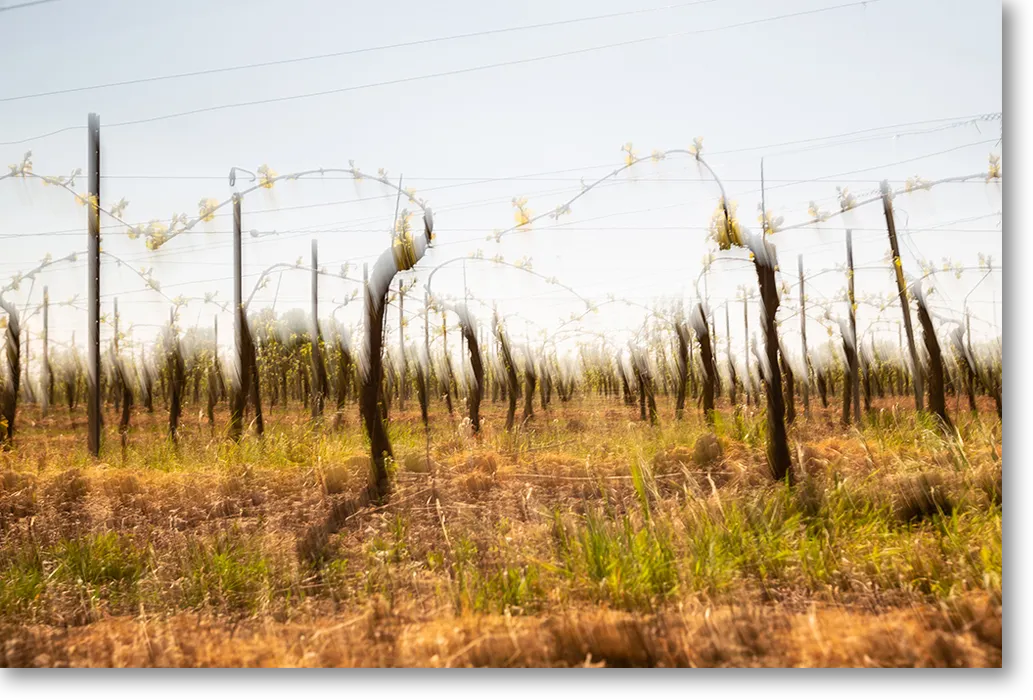Dieses Werk entstand zwischen den Rebzeilen, dort wo Ordnung und Natur aufeinandertreffen. Die bewusste Bewegung während der Aufnahme verwandelt die strenge Geometrie der Weinbergsstruktur in eine fließende, organische Komposition. Du siehst nicht nur die Reben, Du spürst den Rhythmus, der sie durchzieht.
