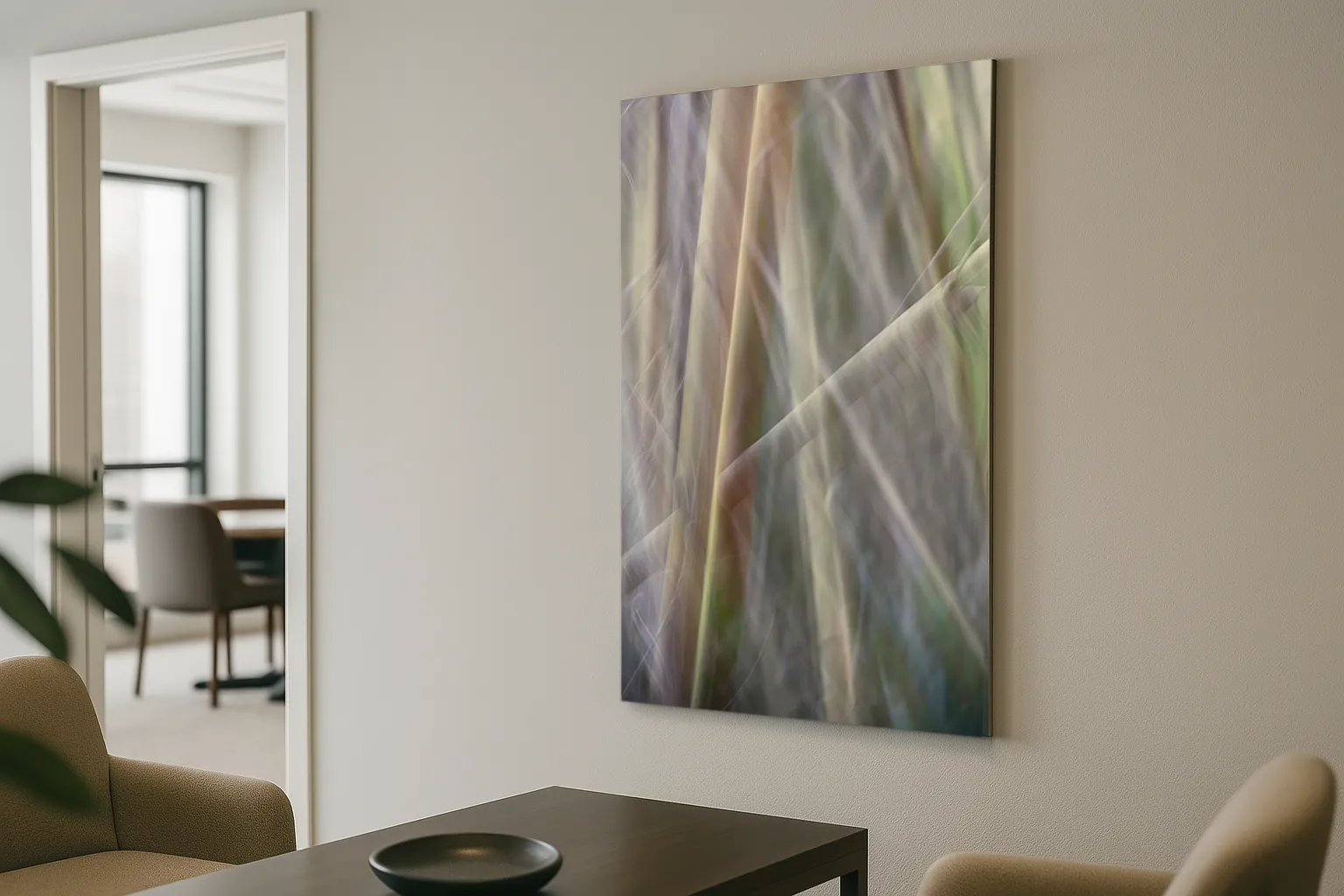 In privaten Räumen wird „Stäbe der Zeit” zu einem Ort der inneren Einkehr. Es eignet sich besonders für Schlafzimmer, Meditationsräume oder Wohnbereiche, in denen Du zur Ruhe kommen möchtest. Die sanften Farbtöne und die vertikale Linienführung schaffen eine Atmosphäre der Leichtigkeit und Weite, ohne aufdringlich zu sein. Das Werk begleitet Dich durch den Tag – morgens als stiller Impuls, abends als Einladung zum Loslassen. Es hilft Dir, Dich zu zentrieren, den Alltag hinter Dir zu lassen und den Moment bewusst zu erleben. Hier wird das Werk zu einem visuellen Anker für Balance und Achtsamkeit.